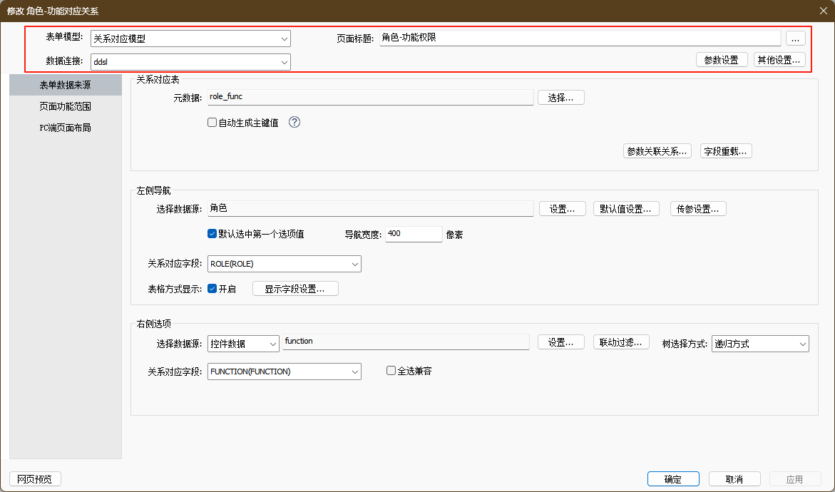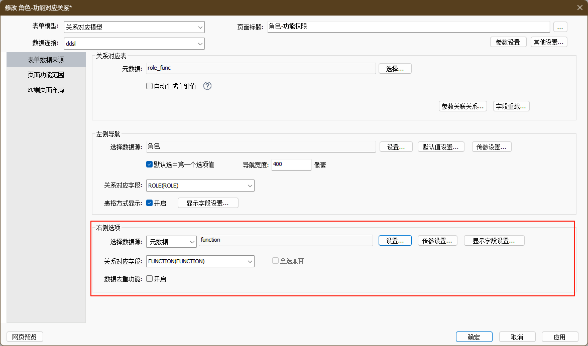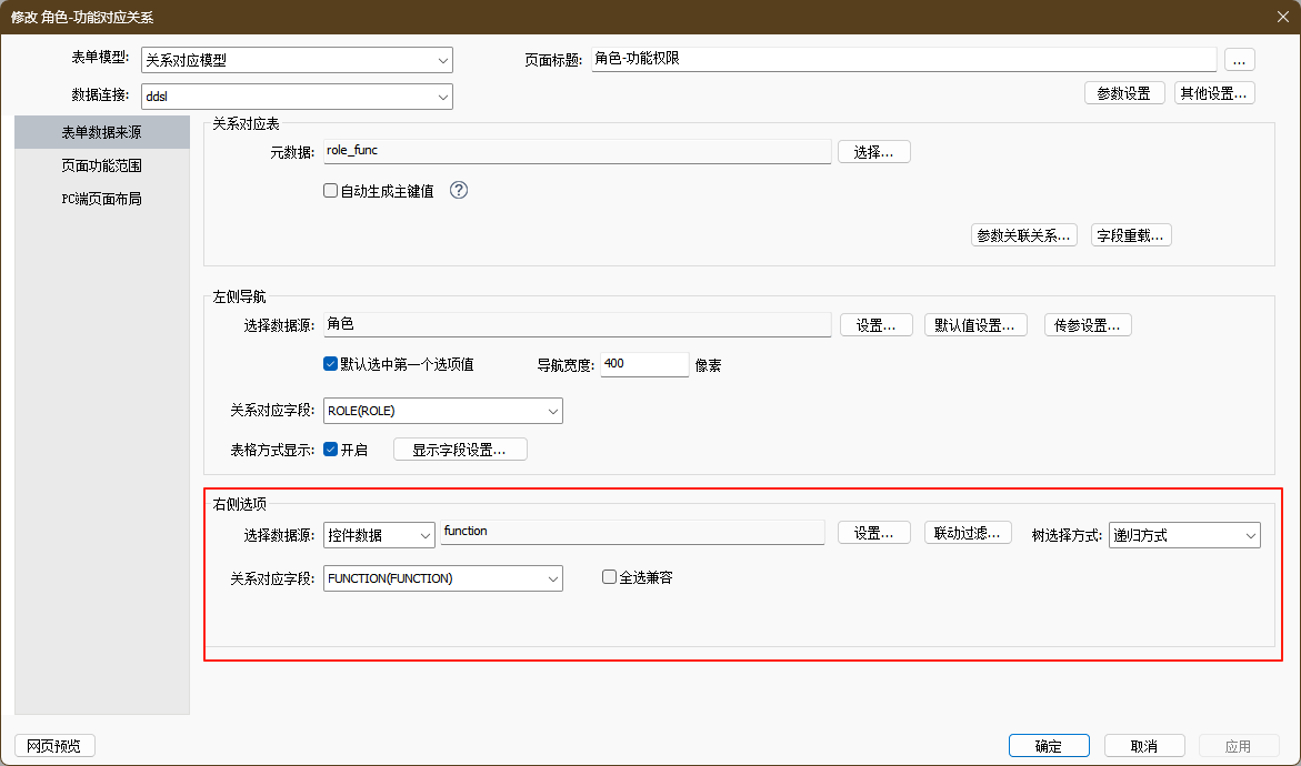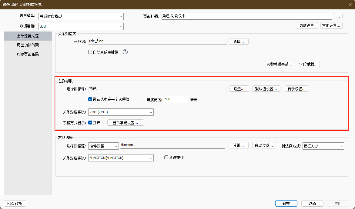 接下来是该模型的关键配置“表单数据来源”,主要包含关系对应表、左侧导航、右侧选项的配置。
