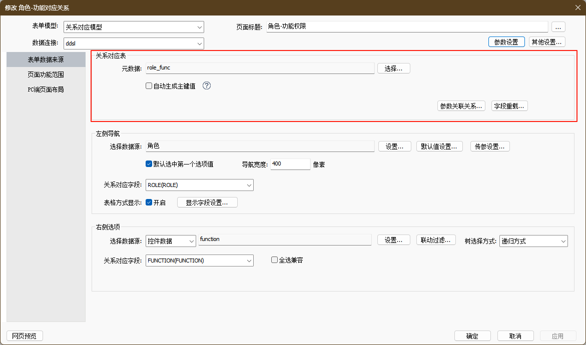 使用提前准备好的关系对应表role_func创建元数据如下图所示。导入所需的字段即可,关系对应模型因为及界面特殊,在元数据中对字段的编辑控件和展示样式没有什么需要配置的地方。