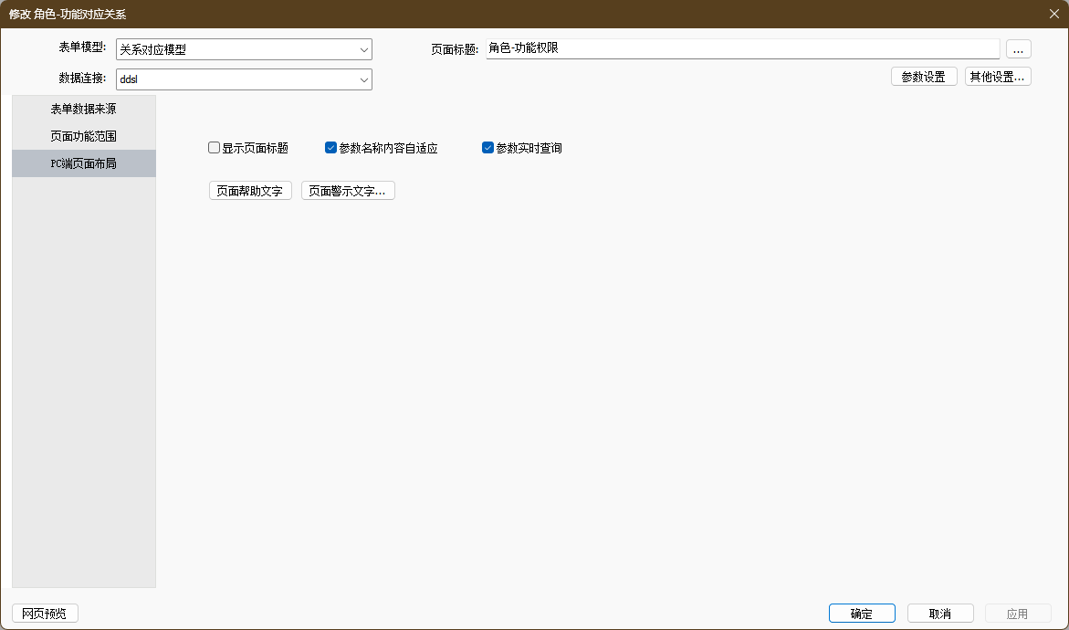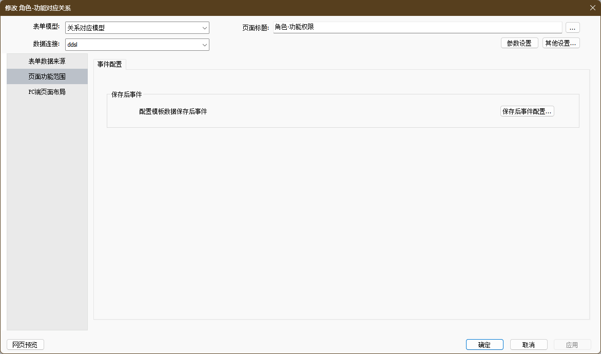其中页面标题、数据连接等常规配置同其他模版,均不允许为空。注意:此处数据连接需选择关系对应表对应的数据连接。