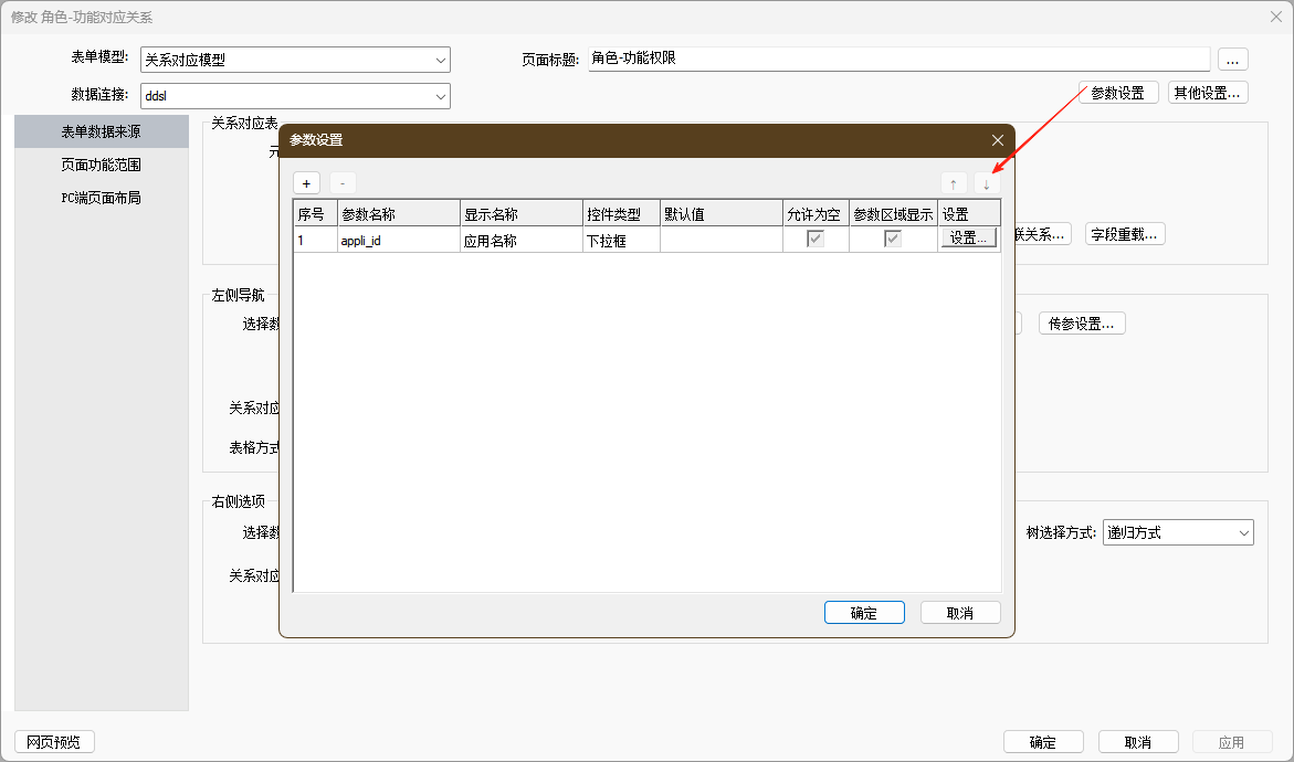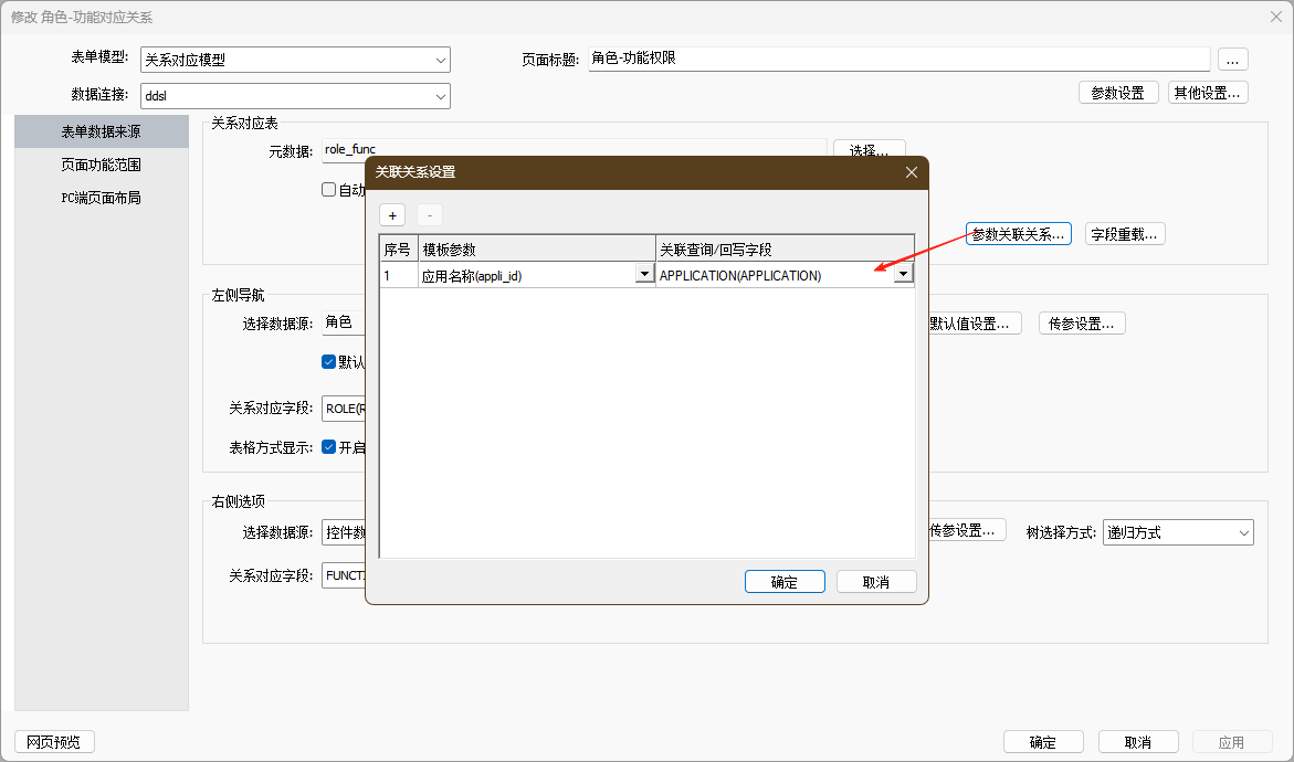 - 参数关联关系:用于配置定义过的参数与数据表字段的查询和回写关系。
