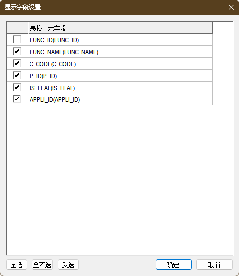 - 显示字段设置:设置前端表格显示字段,列出当前所选数据源关联的元数据列表页面显示的字段,多选,至少勾选一项。