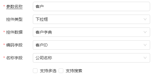 关键的操作步骤在于设置控件数据,选择一个模板数据源作为下拉框的数据来源,并设置正确的编码字段和名称字段。以“客户”参数为例,设置如下图: