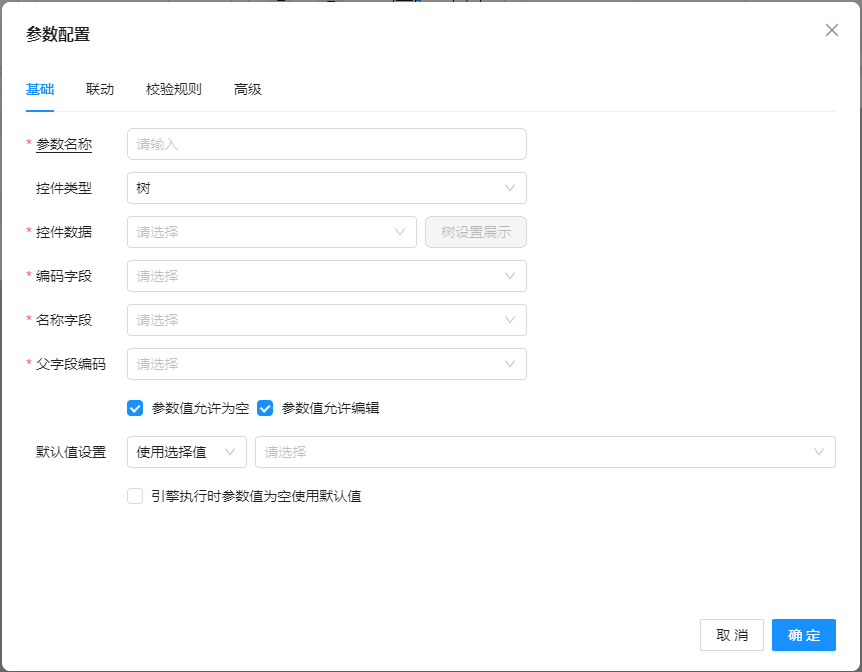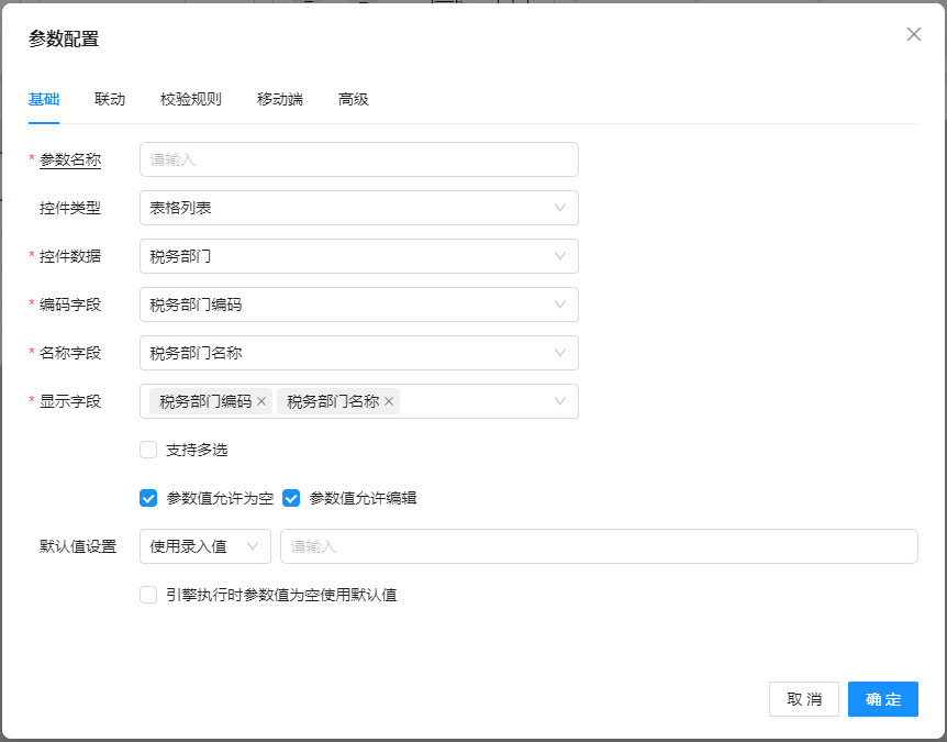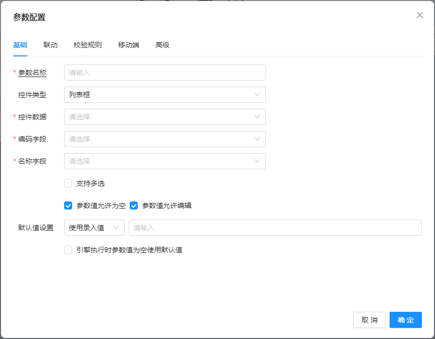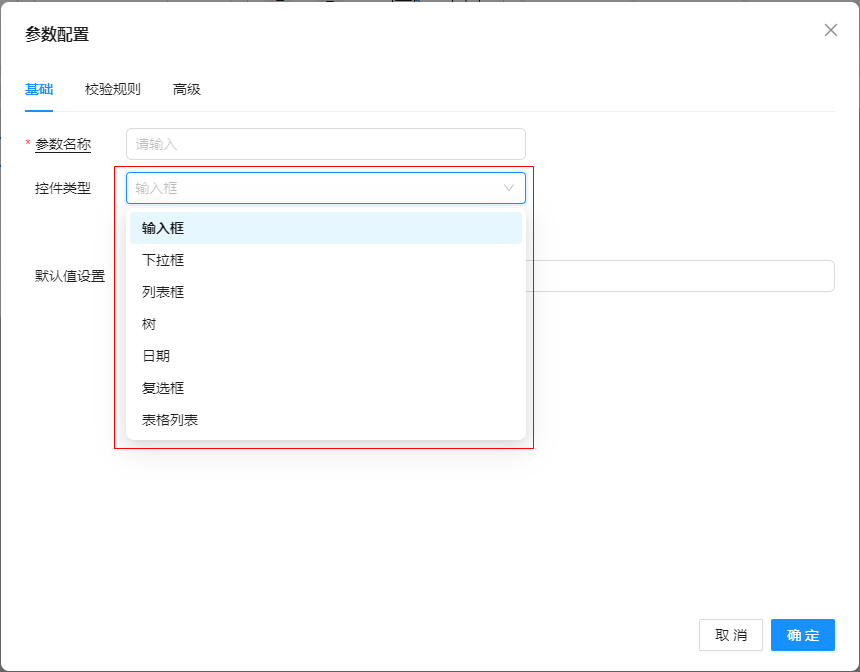 参数支持的控件类型包括: 输入框、下拉框、列表框、树、日期、复选框和表格列表,如下图: