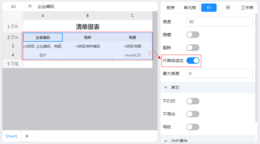 3)所有行均设置为“行高自适应”,如下图: