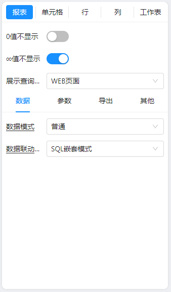 属性区是针对报表的各种属性配置,具体分为:报表、单元格、行、列和工作表。其中: