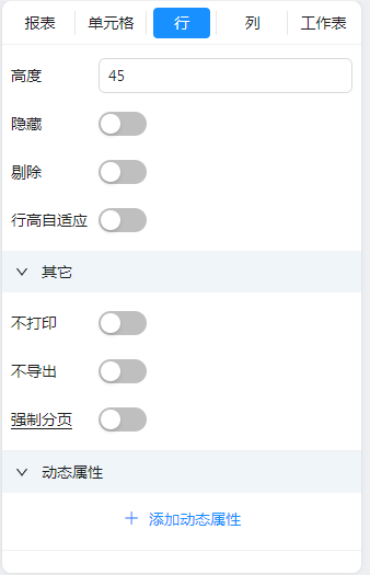 是针对所选行进行相关配置,包括:行高、隐藏、行高自适应、是否导出、强制分页等配置。