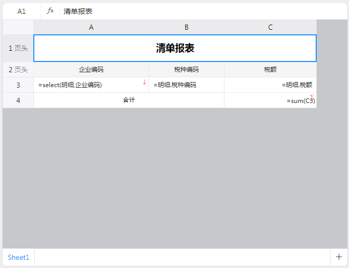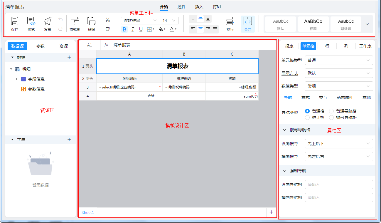 中间的设计面板是报表模板的“单元格”工作簿,类似于Excel。