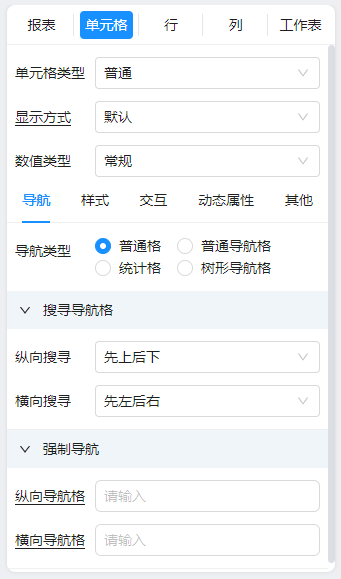 是针对每个单元格的配置,包括:单元格类型、导航类型、样式、超链接、联动等配置。