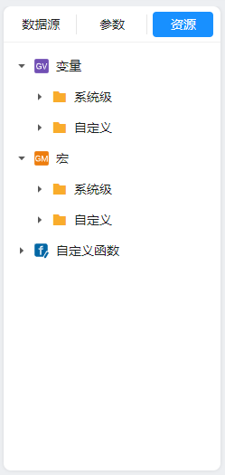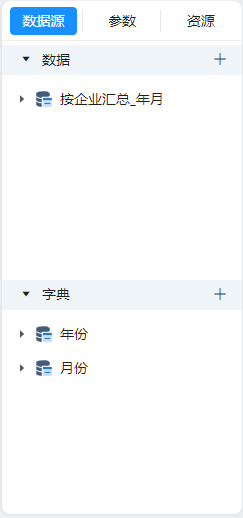 左侧的“资源区”主要用来管理当前模板需要使用的资源,包括:数据源、参数和资源。