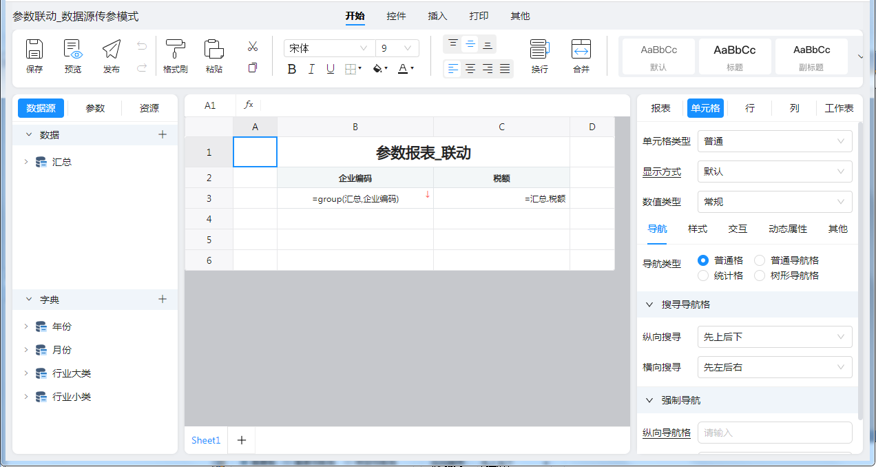 3)报表预览时,当用户改变参数区域中“行业大类”的值时,会触发“行业小类”控件的取数范围自动变化。