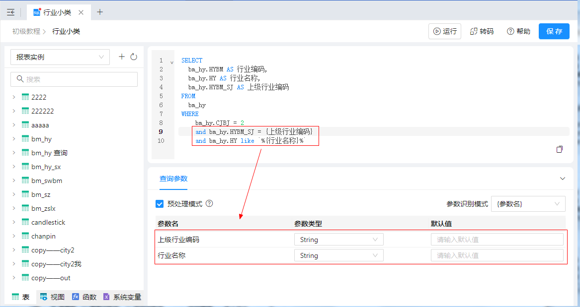 此处与“SQL嵌套模式”不同的是:增加了一个参数“上级行业编码”。
