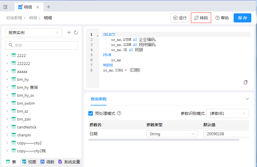 上述操作后,报表使用该数据视图的时候,如何转码“税种编码”字段呢?