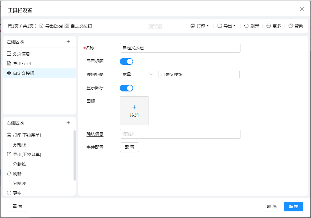 部分按钮支持个性化设置,添加到左侧或右侧区域的按钮选中后,右侧将显示对应的配置项,比如添加“导出Excel”按钮并为其进行设置,如下图: