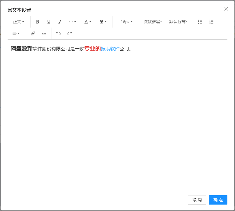 富文本是指可以对字体进行样式设置的一种文本,辅助 单元格样式 展现更多更精彩的报表模板。一个单元格中,所有内容只能设置一种样式,通过富文本可将一个单元格中的内容设置不同的样式。