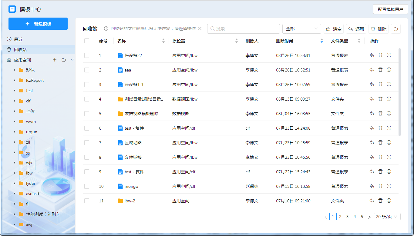 回收站中显示的文件也是有数据权限的,当前登录用户只能看到自己删除和自己创建被删除的文件,系统管理员和应用管理员可查看所有被删除的文件。
